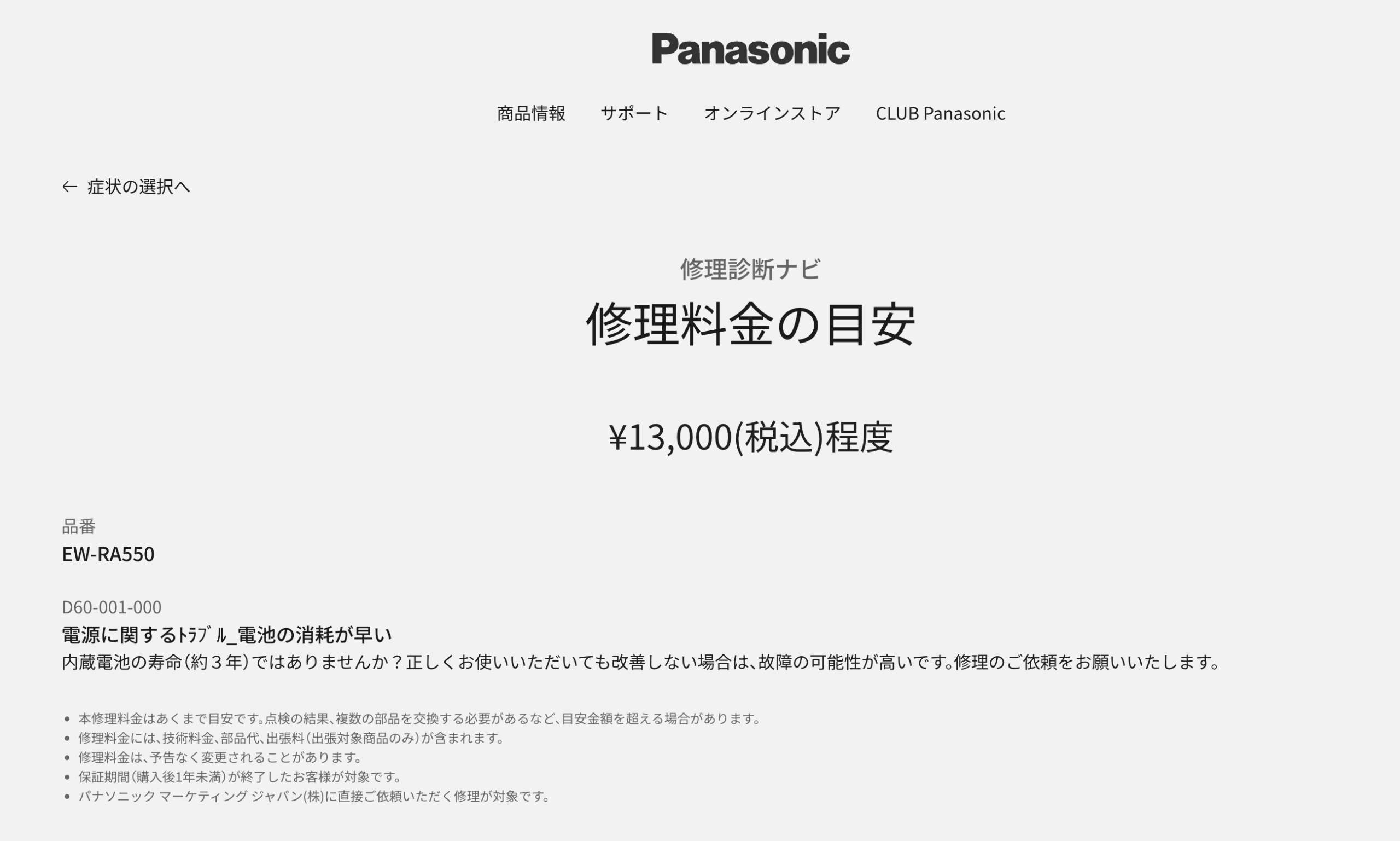 コリコランワイドの内蔵バッテリーは本体一体型なので自分でバッテリー交換したりはできませんが、満充電しても治療可能時間が極端に短くなったとか、充電器に長時間充電しても本体が動かなくなったなどの「バッテリーの寿命」が疑われる場合は修理が可能です。コリコランワイドの使用頻度にもよりますが、平均的なバッテリー寿命は3年なので、購入から3年過ぎて「バッテリーのヘタリ」が気になってきたらパナソニックの公式サイトのサポートページから型番で検索して修理をお願いしてみましょう。気になるバッテリー修理の金額ですが、13000円程度だそうです。コリコランワイドの平均的な実売価格が35000円ぐらいなので、修理代金がこれぐらいなら買い換えるよりも修理に出して使い続ける方がお得ですね。本体購入時に販売店の延長保証(5年保証とか?)もつけた人は、それを利用すれば1回分ぐらいのバッテリー修理代金はまかなえそうなので、延長保証も悪くないと思います。