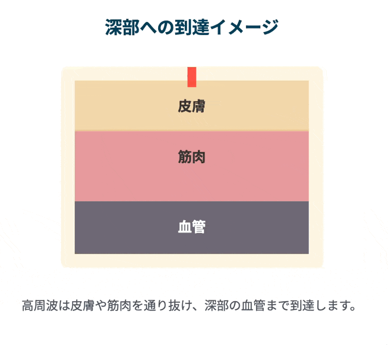 高周波治療は、体の深部にある血管を拡張し、血行を促進します。コリの深部までアプローチすることで、慢性的な肩・腰のこり、血行不良によるこりなど、体の不調を根本的に改善することを目指せるのです。