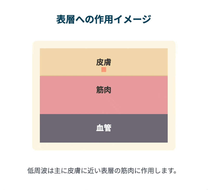 低周波治療は、約3〜1,200Hzほどの低い周波数の電気の波を用います。この周波数は皮膚抵抗が大きいため、「ピリピリ」「トントン」といった体感があるのが特徴です。